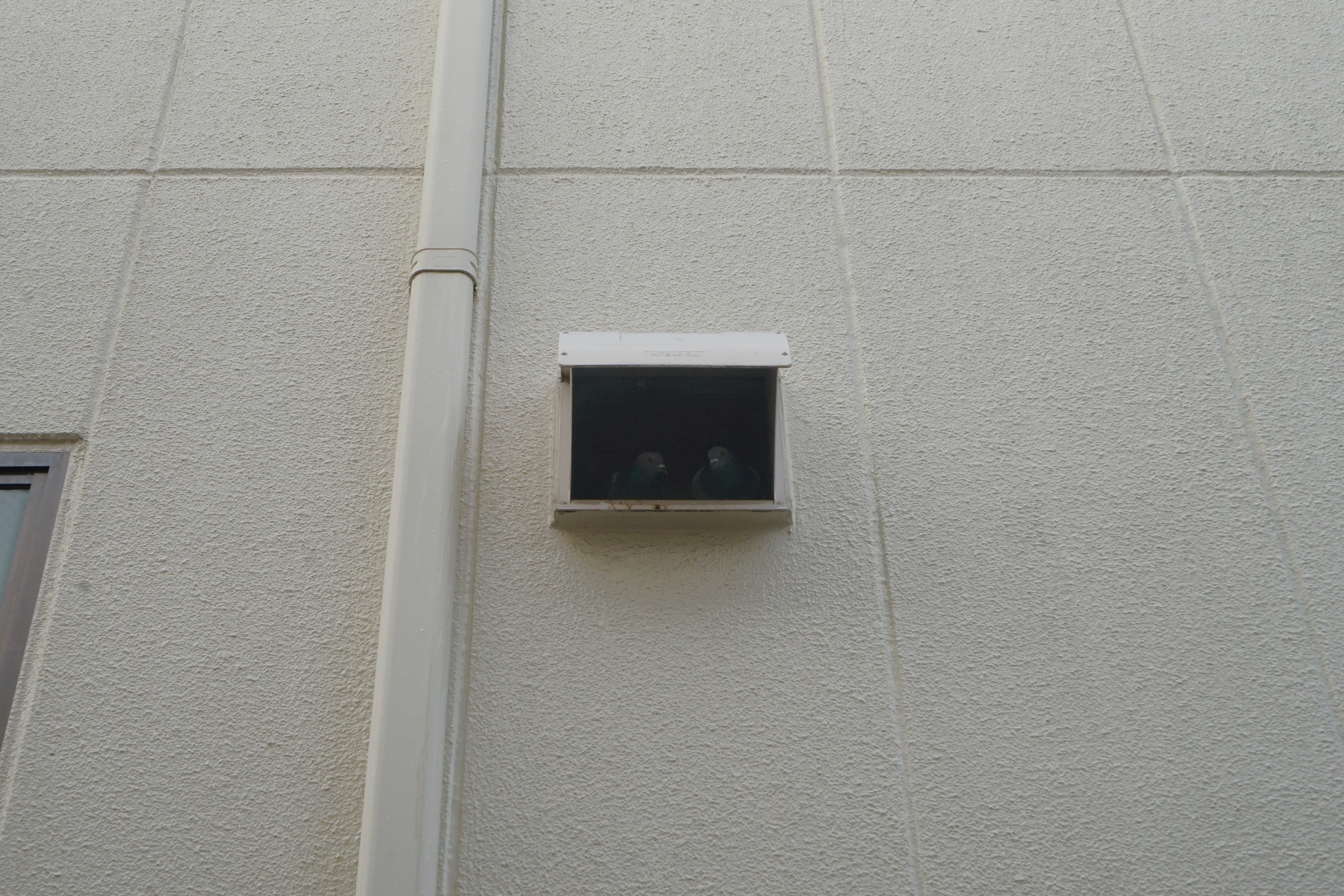 隣のビルの換気口に二羽の鳩が住みついています🐦。